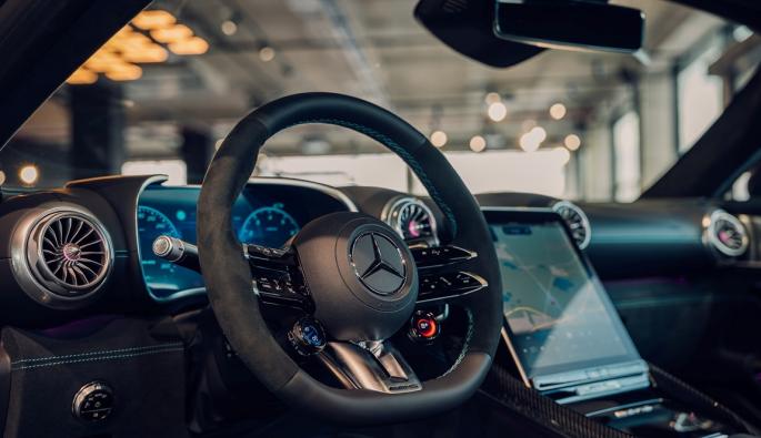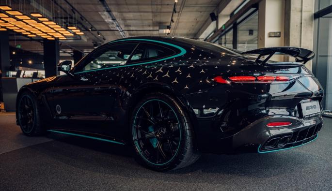 Разбира се, има и специални елементи. Например специалното лаково покритие Obsidian Black Metallic, както и ръчно нарисувани звездни мотиви. Акцентиращите цветове са в тона на отбора от Formula 1. Покритието има дишаща външна част със специална тъкан, която е устойчива на развитие. Вътрешната част пък е антистатична с фланел. Това предпазва автомобила от прах и драскотини. Включен е и AMG аеродинамичен пакект.