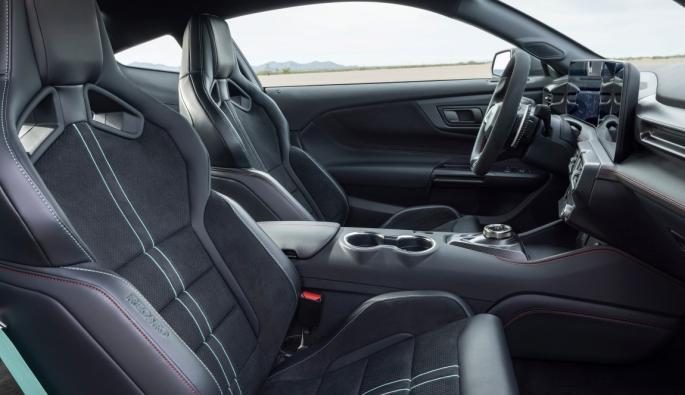 Интериорът отразява мисията на автомобила, фокусирана върху пистата. Той е снабден с волан с плосък долен край от Mustang GTD, обвит в кожа и алкантара. Пакетът за писта заменя задните седалки с рафт за съхранение и както и стандартните предни седалки с кожени спортни Recaro.