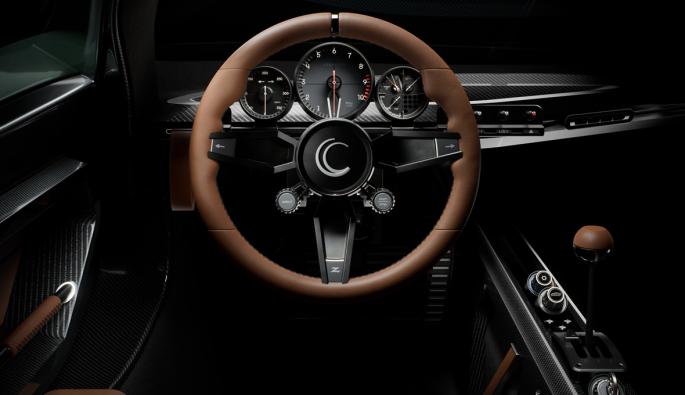 Вътре водачът разполага с три аналогови измервателни прибора, подредени зад кожения волан, на който има само два бутона - старт-стоп и селектор за режим на шофиране. Това е всичко. Кабината разполага с фиксирани седалки, заедно с регулируеми педали, волан и селектор на предавките. Водачите могат да регулират скоростния лост надлъжно със 7,9 см. Почти цялата кабина е изработена от въглеродни влакна, а Capricorn е изработила превключвателите от масивен титан и алуминий. Седалките са тапицирани с кожа Connolly с акценти от Alcantara, а клиентите ще имат възможност да ги персонализират.