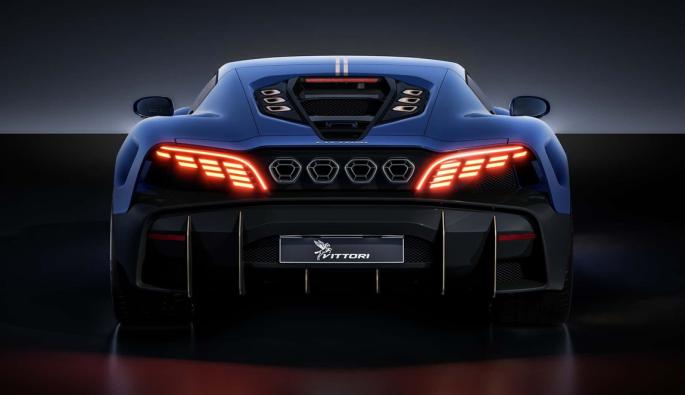 Проектиран в сътрудничество с Pininfarina, новият хиперавтомобил на Vittori не изглежда зле; той има нюанси от McLaren GT в ДНК-то си, особено в предната част и в цялостния профил. Шестоъгълната решетка е уникална, с два големи вентилационни отвора от двете страни, точно под ултратънките фарове. Задната част е малко по-натоварена. Драматични, ъглови задни светлини обграждат четирите ауспуха в центъра на бронята. Масивен дифузьор с вертикални детайли се издига до основата на светлините, докато бронзови акценти контрастират с красива наситено синя боя.