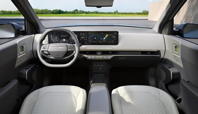 В интериора се залага на дизайн „кутия за пикник“, каквото и да значи това. На нас ни е позната тройната конфигурация от екрани (12,3-инчов дисплей пред водача, 5,3-инчов екран за климатик, 12,3-инчов централен сензорен екран). Допадат ни светлите цветове, със сигурност има доста сериозно количество рециклирани и рециклируеми материали. Колата ви посреща с HELLO при влизане и “HAVE A NICE DAY” в края на пътуването.