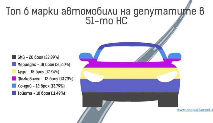 Що се отнася до предпочитаните от депутатите марки МПС, може би не е изненада, че на първо място е BMW, следвана от Mercedes и Audi. Декларираните автомобили на тези марки са съответно 20, 18 и 15. В топ 6 фигурират още VW (12), Hyundai (12) и Toyota (10). Сборът е 81,99%, така че явно има още някакви други марки.