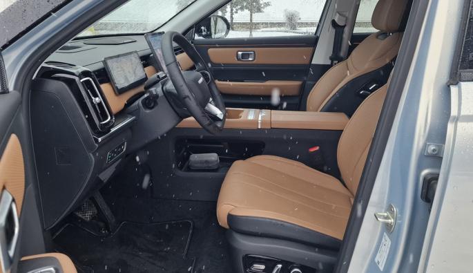 Авантюристичният дух в интериора отсъства в „седмицата“ на Jaecoo, какъвто е заложен по default в гените на марката. Вместо това е заложено за изчистените линии. Имаме метални дръжки на вратите, страничните вентилационни отвори и високоговорителите на А-колоните. Кафявата синтетична кожа (една от двете опции, цветът имам предвид, кожата си е стандарт) стои малко натрапчиво, но явно този оттенък е любим на китайците, защото съм го виждал в не един и два модела (при GWM H9 е още по-експресивен). Материалите по таблото не са от най-меките възможни, Lynk&Co08 изпъква тук (цената му също е доста по-висока), но и пластмасите в новия Kia Sportage хич не са меки и са повече като количество.