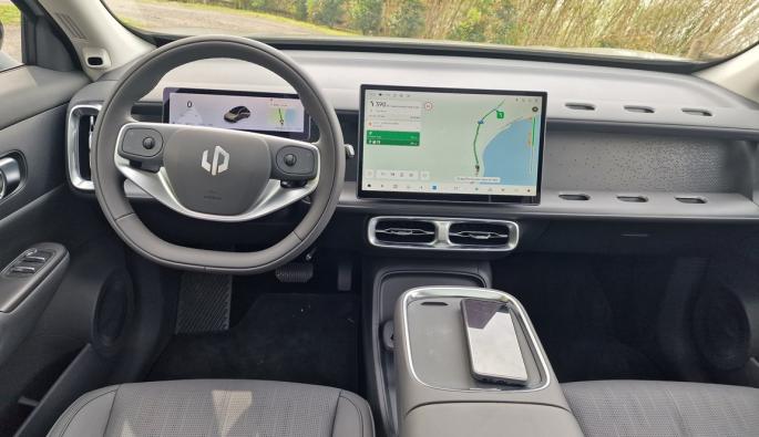 На волана има бутон за бързо изключване на дразнещите му предупреждение за превишена скорост и асистента за следване на лентата на движение, а с плъзгане отгоре надолу по централния дисплей се отваря меню за бърз достъп до най-често използваните функции. Такава, естествено, е тази на климатика, който си следва собствена логика на работа и се изисква време, за да свикнеш с това.
